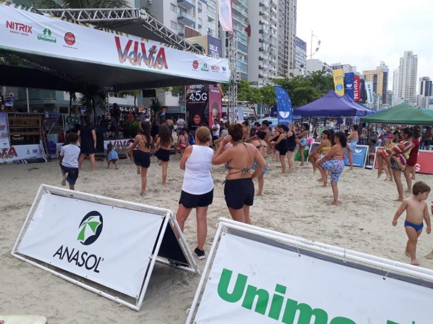 O “Projeto Viva Verão”, edição Balneário Camboriú, é um evento de grande porte que acontece há mais de 10 anos na praia Central, destinado ao público local e turistas que gostam de esportes e atividades à beira-mar. A grande atração do Viva o Verão 2019 foi o Palco de Verão, com parede de escalada, dança, aeróbica, zumba, massagem, medição de pressão, teste de glicemia e também pocket shows. Nesse ano, o evento aconteceu entre 10/01 e 10/02, com o apoio da Anasol oficializado com uma das atividades mais procuradas durante o período: Zumba Anasol. Todos os dias, durante as aulas de zumba coletiva, os participantes receberam brindes e kits recheados de protetores solares.