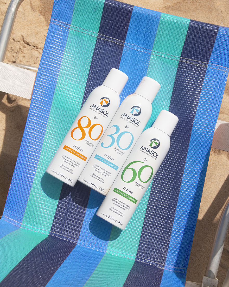 O melhor amigo do verão (e da sua pele) é o protetor solar. É ele que irá te acompanhar durante toda a estação. Para você que busca praticidade, experimente a linha Anasol Aerosol. Do FPS 30 ao FPS 80, com dupla proteção UVA/UVB, Vitamina E com ação antioxidante e filtros de última geração. Fórmula resistente à água e com rápida secagem na pele.