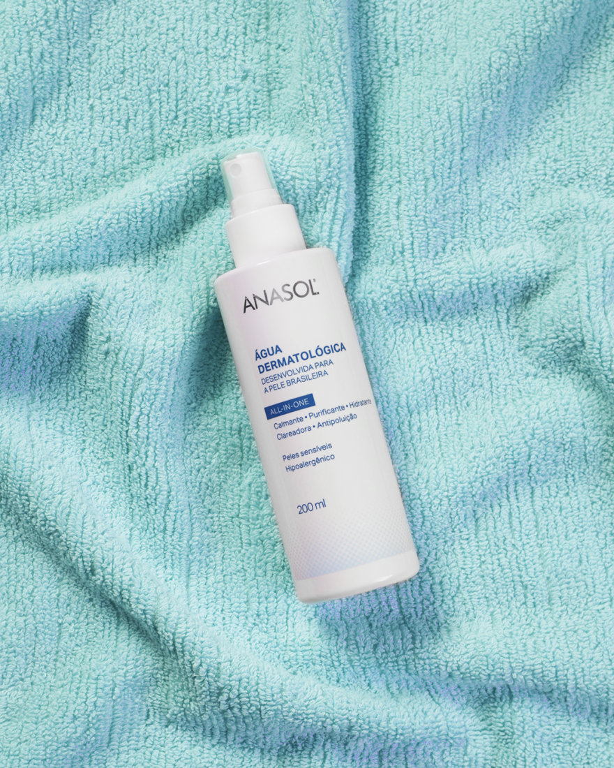 A Água Dermatológica da Anasol é perfeita para acalmar, purificar, hidratar e proteger a pele contra poluentes. Você pode reaplicar sempre que precisar de uma hidratação extra na praia. Ah, ela contém ação clareadora, que ajuda a uniformizar a pele.