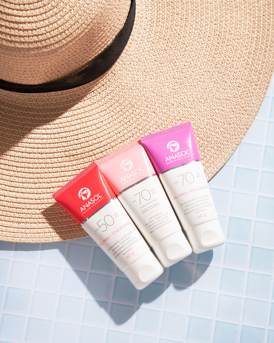 Como já comentamos com você em outro conteúdo (clique aqui), o ideal é você usar um protetor solar específico para o rosto. A linha Anasol contém protetores para todos os tipos de pele e unem proteção e cuidado. Sua formulação contém argila orgânica, vitaminas e filtros solares avançados.
