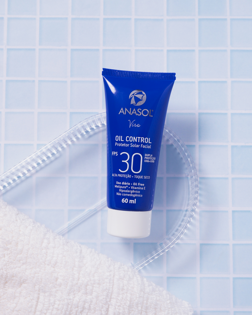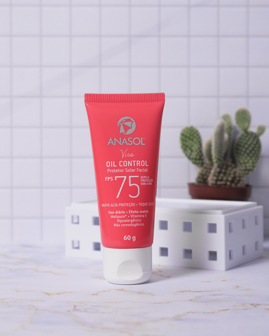 Já os produtos que são oil control auxiliam no controle e na diminuição da oleosidade em excesso. Nessa categoria, geralmente encontramos linhas específicas para peles oleosas e acneicas. Uma boa opção para incluir na sua rotina é o Protetor Solar Facial Oil Control FPS 30 ou FPS 75 da linha Anasol. Pois, além de proteger a sua pele diariamente, ele contém um complexo de micro partículas que absorvem a oleosidade excessiva sem ressecar. Deixando sua pele protegida, sequinha e hidratada na medida certa. Ele também possui toque seco e efeito matte.