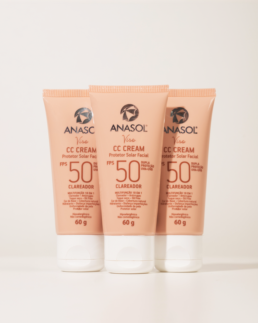 Se você prefere uma opção com cor, conheça o Protetor Solar Facial CC Cream Clareador FPS 50, são 10 ações em um único produto, dupla proteção UVA/UVB, ele melhora e uniformiza o tom da pele com ação clareadora, antirrugas e hidratante. Com toque sequinho e efeito matte, ele disfarça imperfeições com tonalizante que se adapta a diferentes tons de pele. Dermatologicamente testado, hipoalergênico e não comedogênico.