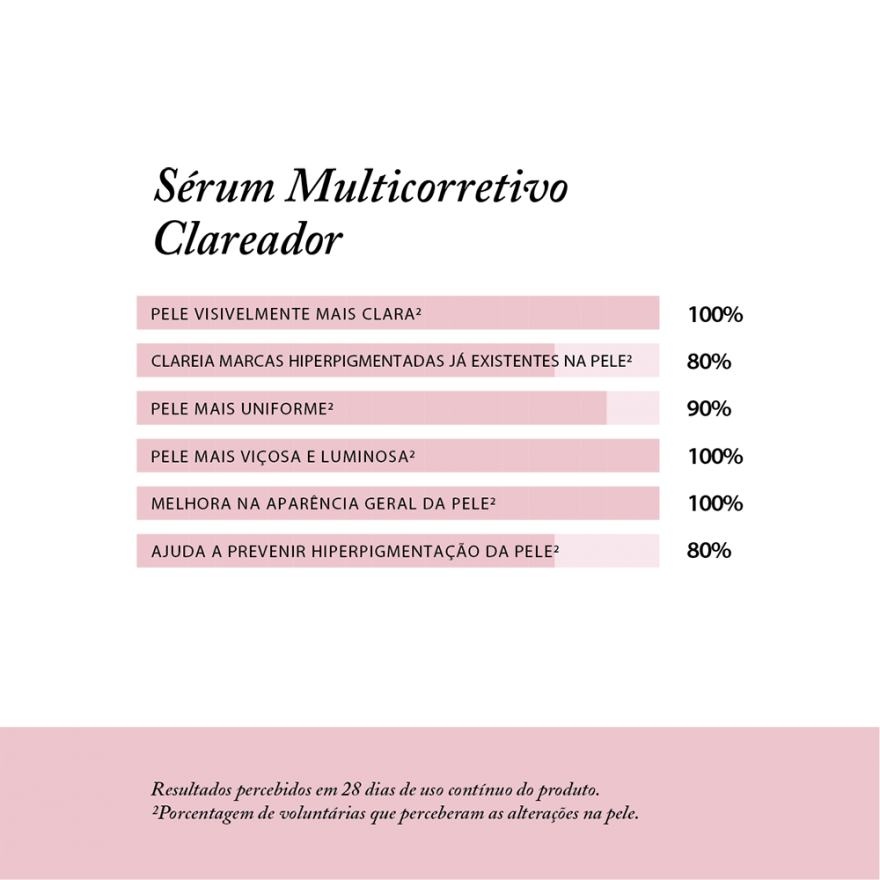 A tríade dos tratamentos de skincare em apenas um vidrinho. O Sérum Multicorretivo Clareador contém esses ativos para tratar 3 fatores que ocasionam manchas: inflamação, desordem na produção de melanina e vascular. O resultado ao final do tratamento (28 dias) é a renovação nas camadas cutâneas mais superficiais, recuperando a luminosidade e uniformizando o tom da pele. E claro, ele é oil free, não comedogênico e hipoalergênico - formulado para minimizar possível surgimento de alergias.