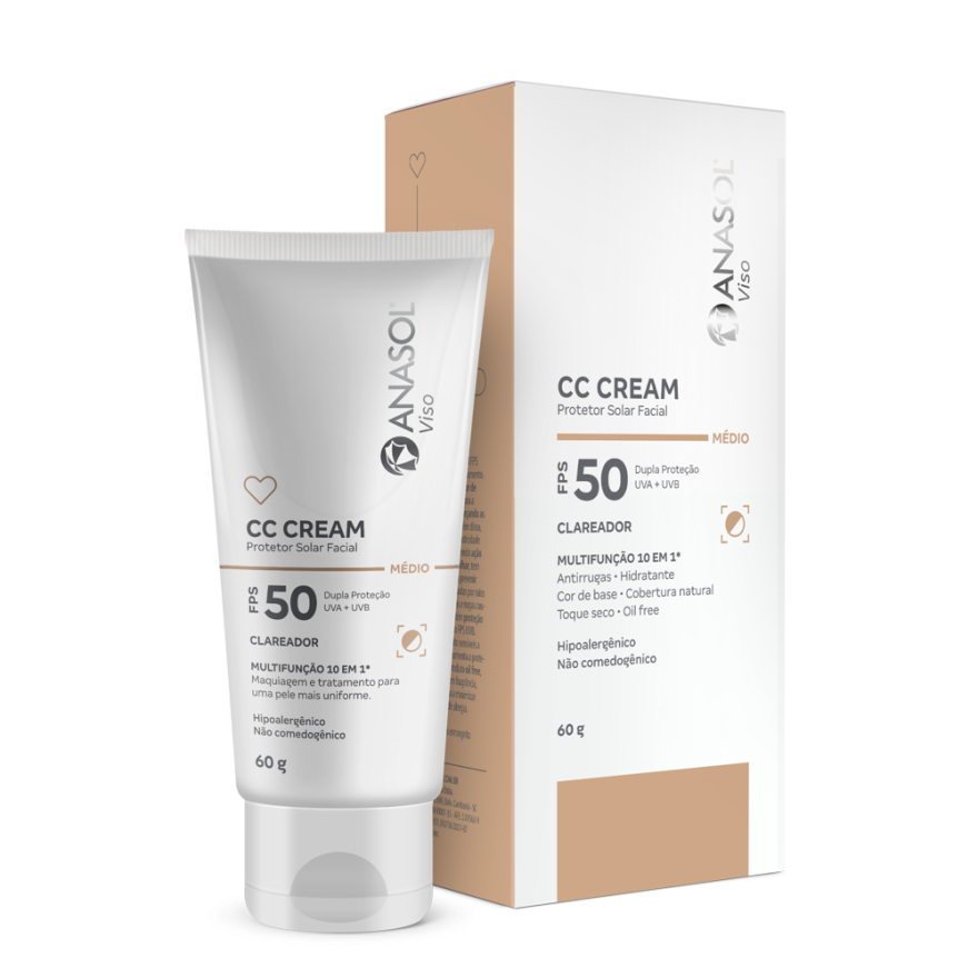 Com 10 benefícios em um único produto, Anasol CC Cream Facial FPS 50 combina maquiagem e tratamento. Sua cobertura natural com cor de base embeleza a face e melhora a uniformidade da pele disfarçando as pequenas imperfeições. Além disso, melhora a hidratação, a elasticidade e a firmeza da pele promovendo ação antirrugas. É fácil de espalhar, tem toque sequinho e ajuda a prevenir queimaduras solares causadas por raios UVB, assim como manchas e rugas causadas por raios UVA. Contém proteção UVA equivalente a 1/3 do FPS UVB. Indicado para peles muito sensíveis a queimaduras solares, aumenta a proteção da pele 50 vezes. Produto oil free, não comedogênico, sem fragrância, formulado de maneira a minimizar possível surgimento de alergia.