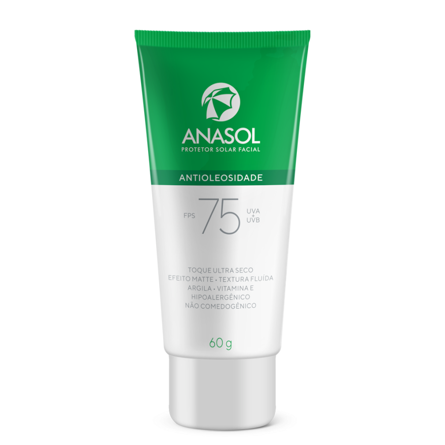 O Protetor Solar Anasol FPS 75 Antioleosidade foi criado para atender às necessidades da pele oleosa, garantindo proteção e bem-estar ao longo do dia. Com uma combinação eficaz de argila orgânica e ativos de alta tecnologia, sua fórmula promove ação detox, ajuda a minimizar a aparência dos poros e proporciona um acabamento "matte" duradouro. Além de controlar o brilho, também reequilibra a pele e oferece ampla defesa contra os raios UVA e UVB. Dermatologicamente testado. Este produto foi formulado de maneira a minimizar possível surgimento de alergia.