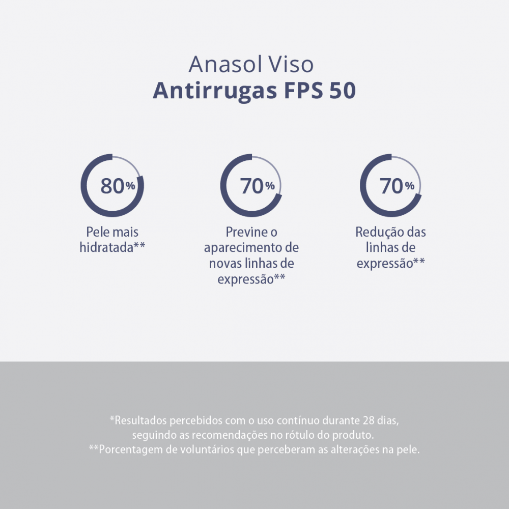 Uso diário. Agite antes de usar. Aplique abundantemente antes da exposição ao sol. Espalhe o produto por todo o rosto e pescoço. Resistente à água. Reaplicar sempre, após sudorese intensa, nadar ou banhar-se, secar-se com toalha e durante a exposição ao sol. É necessária a reaplicação do produto para manter a sua efetividade. Se a quantidade aplicada não for adequada, o nível de proteção será significativamente reduzido. Dica: Para melhores resultados combine com Anasol Facial Antirrugas Noturno.