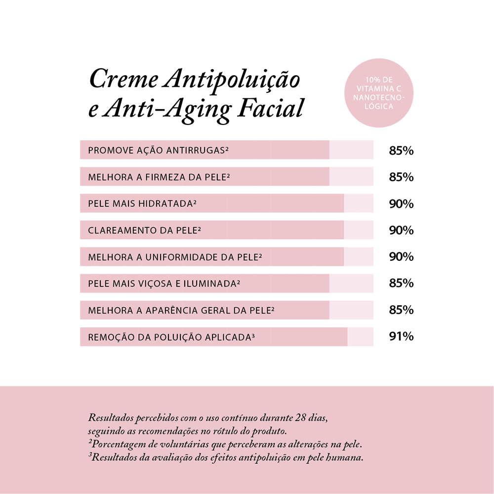 A poluição urbana, juntamente com a rotina agitada, faz a pele perder o viço e a elasticidade, gerando flacidez e envelhecimento precoce da face. O Hidrabene Creme Antipoluição e Anti-Aging Facial, contém ativos que formam um escudo protetor contra a poluição urbana e estimulam a proteção natural da microbiota da pele, junto à Vitamina C Nanotecnológica* que atua sinergicamente no tratamento e prevenção do envelhecimento cutâneo promovendo firmeza, uniformidade, luminosidade e clareamento à pele. Produto dermatologicamente testado, não-comedogênico, hipoalergênico, formulado de maneira a minimizar possível surgimento de alergia.