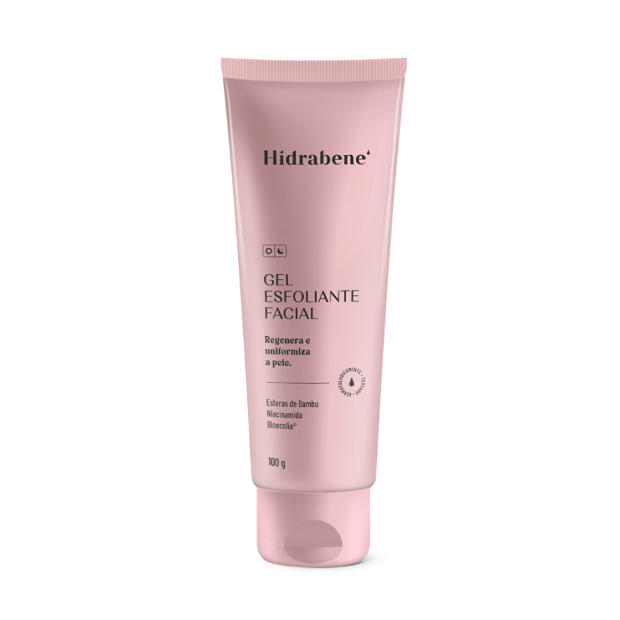 Pele renovada, uniforme, macia e radiante. Hidrabene Gel Esfoliante Facial é indicado para todos os tipos de pele. Promove, através das esferas naturais de bambu, uma esfoliação física suave e remove o acúmulo de sujeiras e células mortas. Contém, ainda, ativos que suavizam, promovem hidratação e estimulam a proteção natural da microbiota da pele. Produto dermatologicamente testado, hipoalergênico, formulado de maneira a minimizar possível surgimento de alergia.