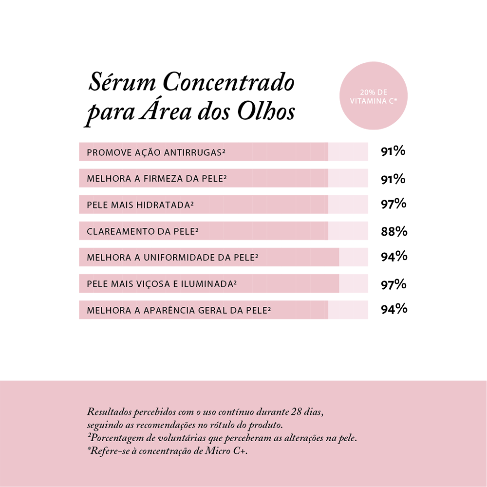 Concentrado em ativos com potente ação Antioxidante (Vitamina C, Ácido Ferúlico e Vitamina E). Tem textura extremamente sedosa, estimula a formação de colágeno tratando e prevenindo o envelhecimento precoce cutâneo. Auxilia ainda a neutralização dos radicais livres, proporcionando clareamento, uniformidade e luminosidade à pele. Produto oftalmologicamente testado, hipoalergênico, formulado de maneira a minimizar possível surgimento de alergia.