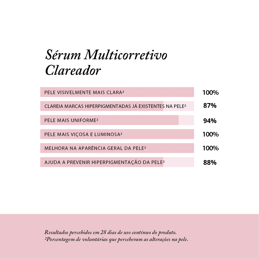 Para diminuir e controlar distúrbios de hiperpigmentação na pele é necessário manter uma sequência de cuidados diários, combinando a aplicação de ativos clareadores. Hidrabene Sérum Multicorretivo Clareador foi formulado com uma rica composição de ativos para clarear visivelmente a pele e reduzir sua tonalidade. O resultado é a renovação nas camadas cutâneas mais superficiais, conferindo mais viço e luminosidade à pele facial. Produto oil free, não comedogênico, hipoalergênico, formulado de maneira a minimizar possível surgimento de alergia.